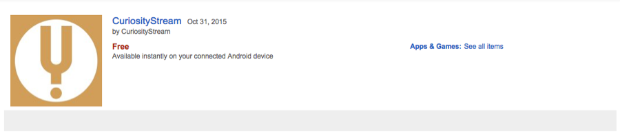 Suchen Sie auf der Amazon-Startseite in der oberen Suchleiste nach „Curiosity Stream“. Die Curiosity Stream-App sollte angezeigt werden. Klicken Sie auf das Logo oder den Titel, um zur Detailseite zu gelangen.