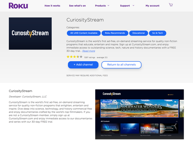 - You should then see a "Curiosity Stream" Roku channel among your other channels on the "My Channels" screen of your Roku device.