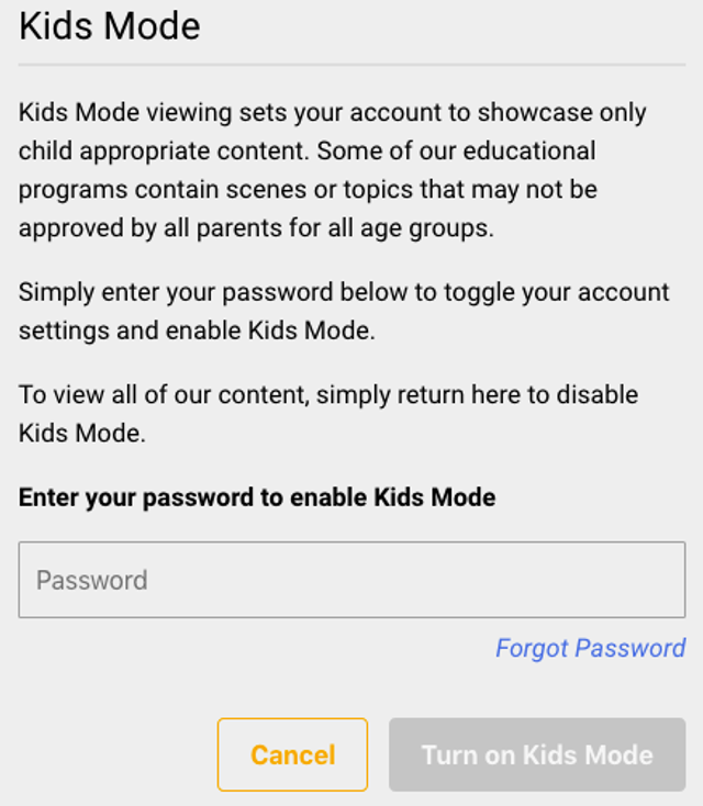 If you wish to turn on Kids Mode, visit https://curiositystream.com/login and select the "Your Account" page from the top right corner drop-down menu. On the Account page, scroll to the SETTINGS section ( this will be toward the middle of your Account). You will see an option to “Turn Kids Mode On”.